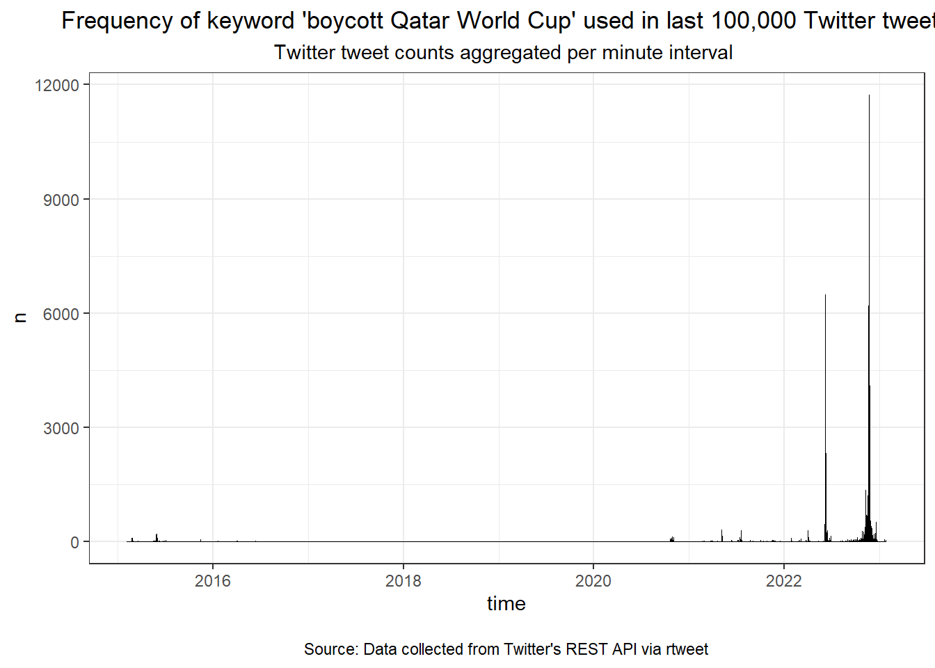# Plot by timets_plot(tweets_boycott,"mins",cex=.25,alpha=1) +theme_bw() +theme(text =element_text(family="Palatino"),plot.title =element_text(hjust =0.5),plot.subtitle =element_text(hjust =0.5),plot.caption =element_text(hjust =0.5)) +labs(title ="Frequency of keyword 'boycott Qatar World Cup' used in last 100,000 Twitter tweets",subtitle ="Twitter tweet counts aggregated per minute interval ",caption ="\nSource: Data collected from Twitter's REST API via rtweet",hjust =0.5)
