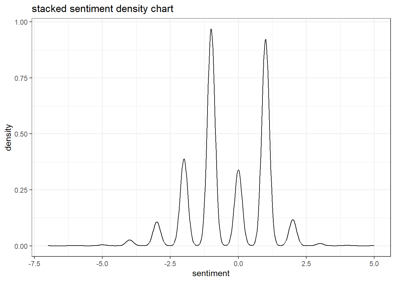 # Use Plotly library to plot density chartggplot(sentiment_tw, aes(sentiment, fill = posneg)) +geom_density(alpha =0.5, position ="stack") +ggtitle("stacked sentiment density chart")+theme_bw()