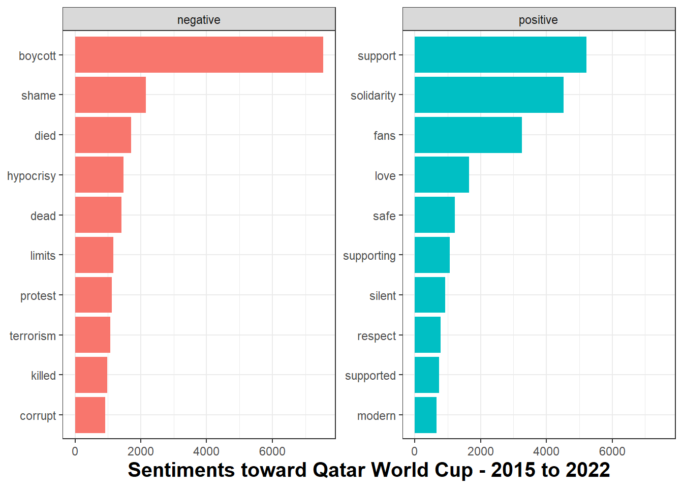 bing_word_counts %>%group_by(sentiment) %>%top_n(10) %>%ungroup() %>%mutate(word =reorder(word, n)) %>%ggplot(aes(word, n, fill = sentiment)) +geom_col(show.legend =FALSE) +facet_wrap(~sentiment, scales ="free_y") +labs(y ="Sentiments toward Qatar World Cup - 2015 to 2022",x =NULL) +coord_flip() +theme_bw()+theme(strip.text.x =element_text(family="Palatino"), axis.title.x=element_text(face="bold", size=15,family="Palatino"),axis.title.y=element_text(family="Palatino"), axis.text.x =element_text(family="Palatino"), axis.text.y =element_text(family="Palatino"))