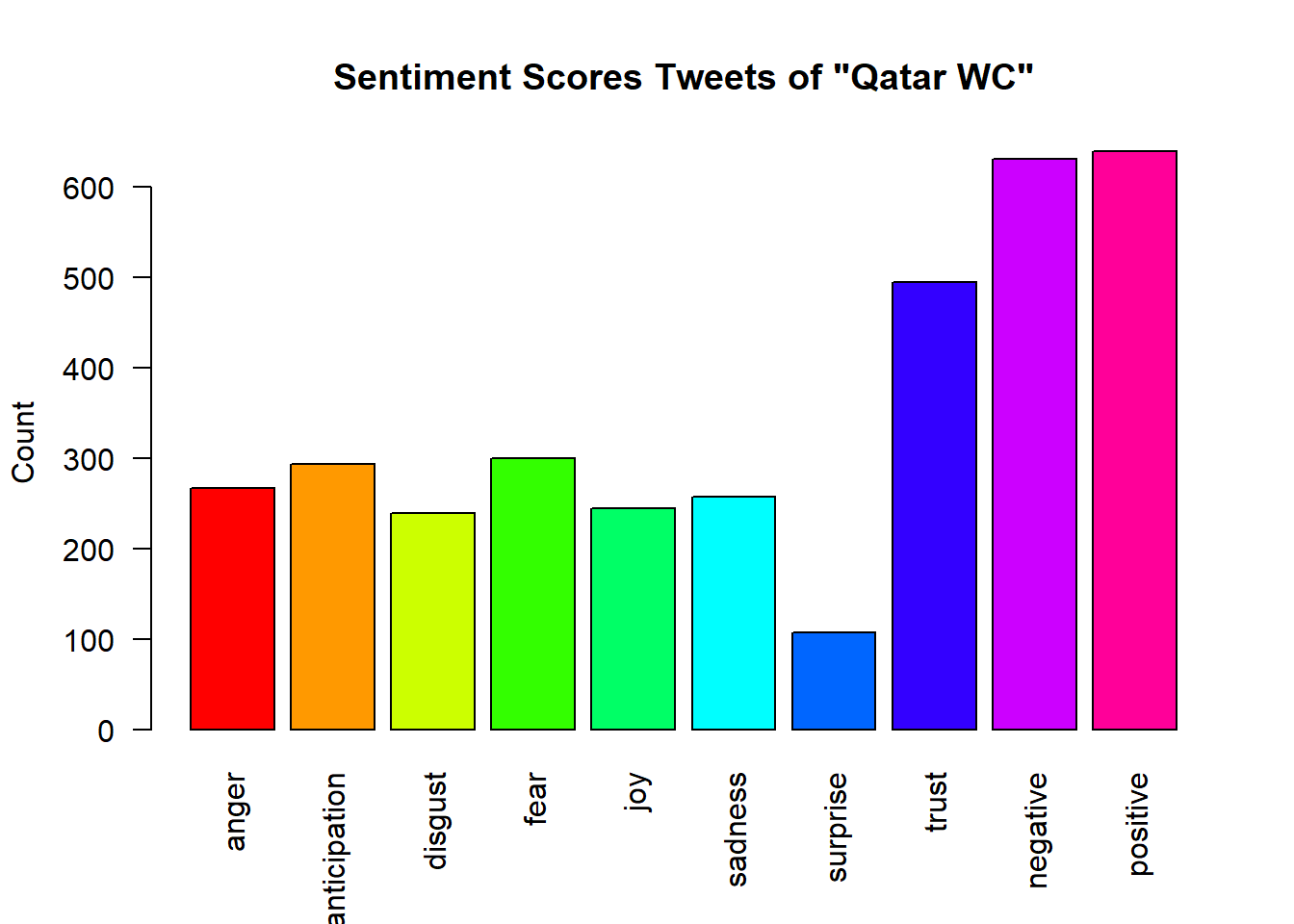barplot(colSums(tw_sent_nrc),las =2,col =rainbow(10),ylab ='Count',main ='Sentiment Scores Tweets of "Qatar WC"')