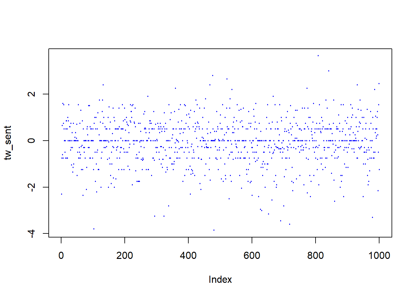tw_sent <-get_sentiment(twtweets) # Get sentiment scores plot(tw_sent, pch=20, cex = .3, col ="blue")