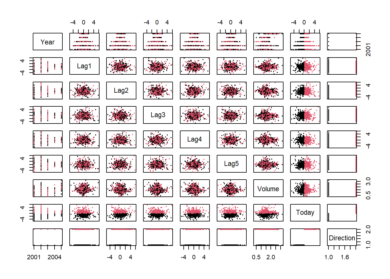 # Create a dataframe for data browsingsm=Smarket# Bivariate Plot of inter-lag correlationspairs(Smarket,col=Smarket$Direction,cex=.5, pch=20)